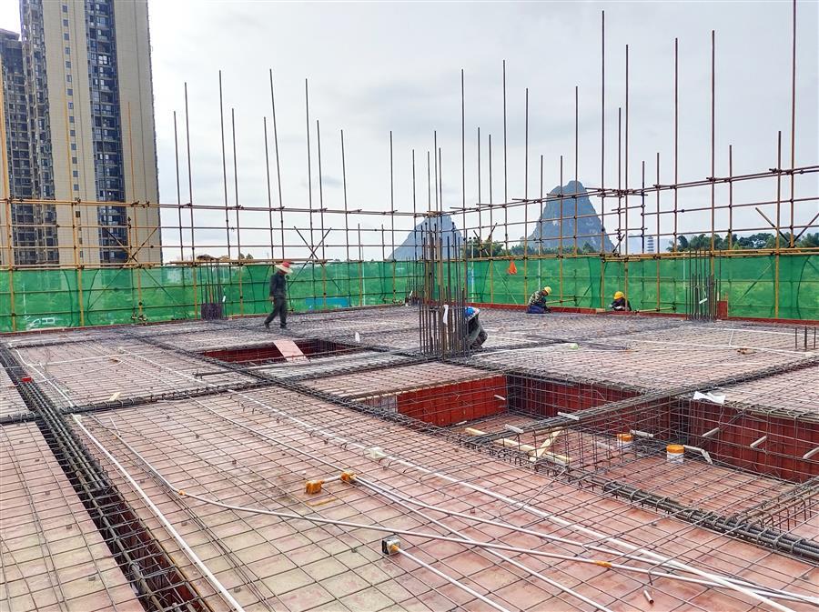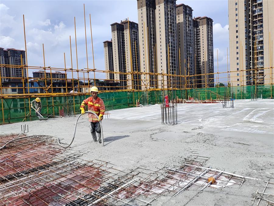 在項目現(xiàn)場,每天有50多名工人頂著高溫,相互配合,有條不紊地進行鋼筋加工、綁扎鋼筋、混凝土澆筑等工作。為了趕工期,他們時常加班加點工作到深夜,同時還認真按照工藝標準逐條逐項落實每一項細節(jié),嚴把工藝質(zhì)量。