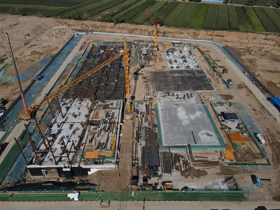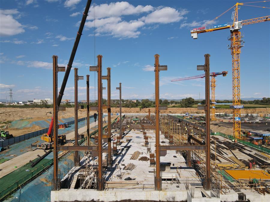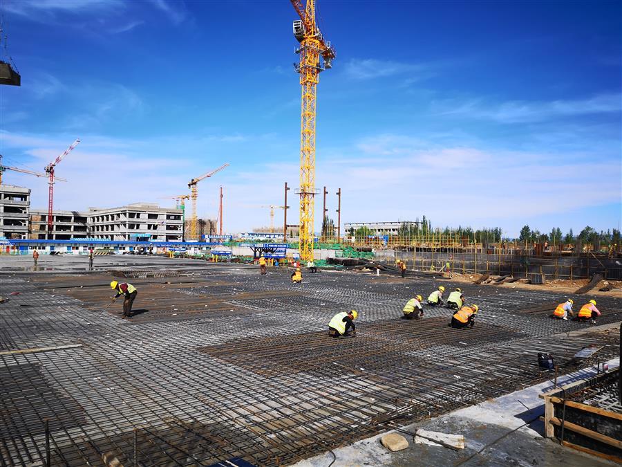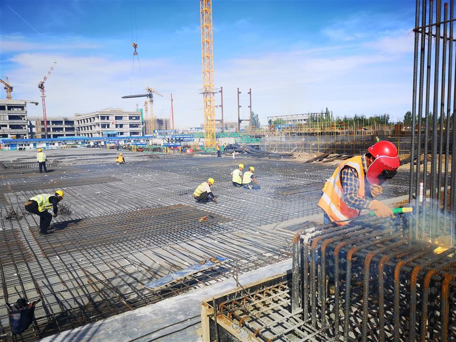 目前,項目正在進行主體施工,施工現(xiàn)場正緊張有序地進行著模板安裝、鋼筋綁扎、水電管線預埋、鋼結(jié)構(gòu)吊裝等工作。