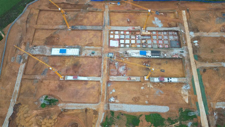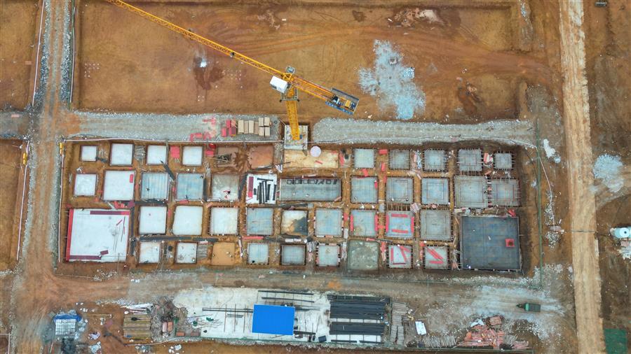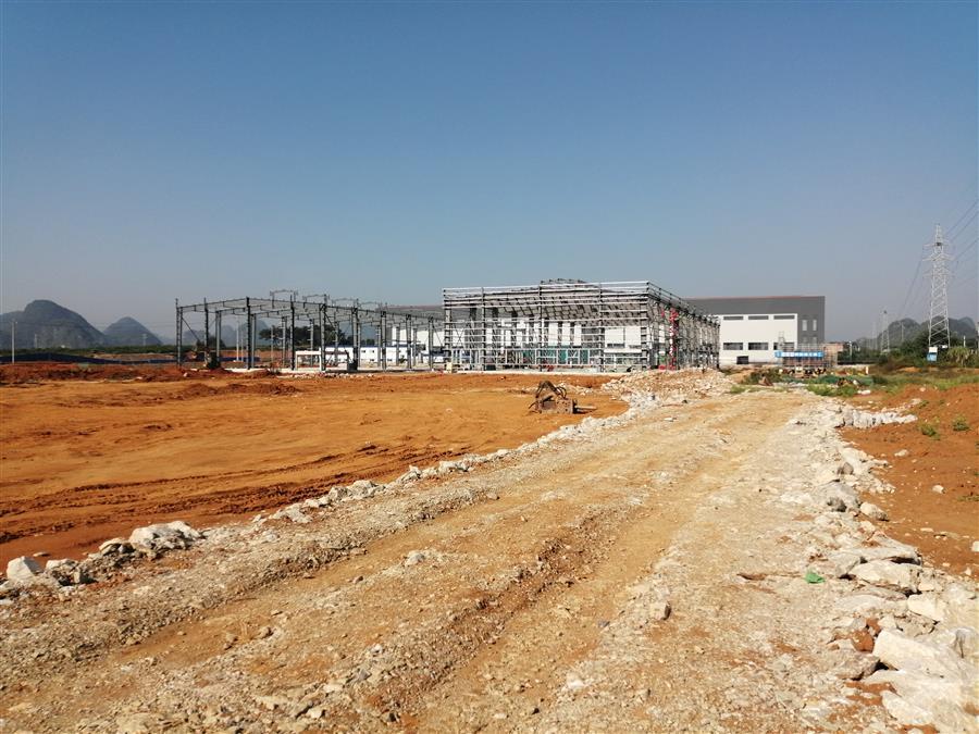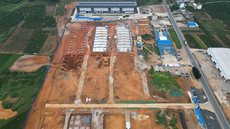 目前,該項(xiàng)目設(shè)備房消防水池外架搭設(shè)、模板安裝已完成,4號廠房側(cè)面檁條安裝完成,5號廠房屋面檁條安裝完成50%,6號樓基礎(chǔ)承臺已完成,4號樓地基處理注漿完成70%等。