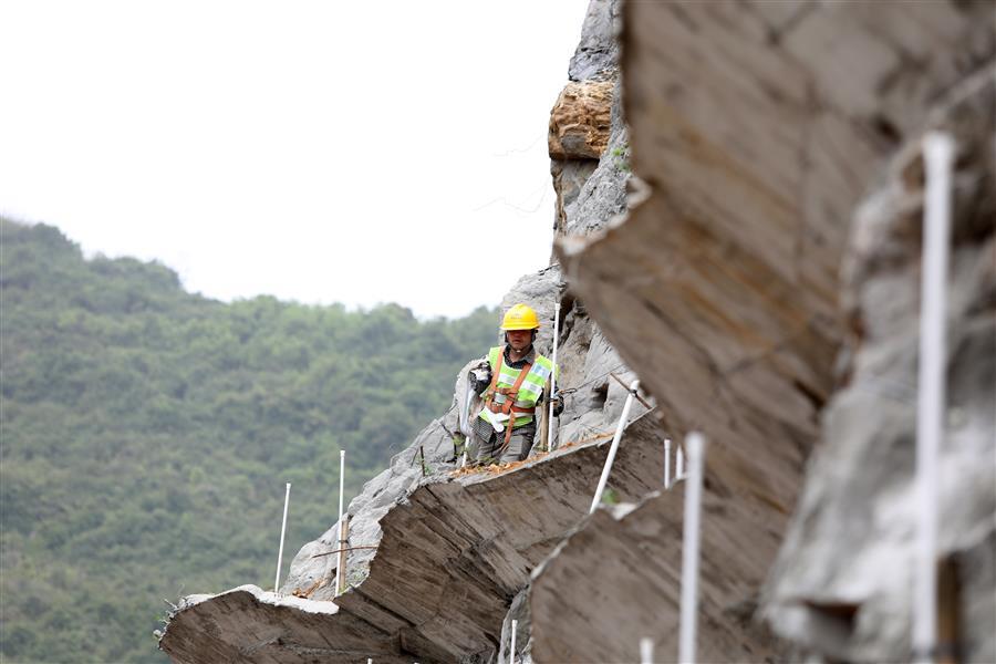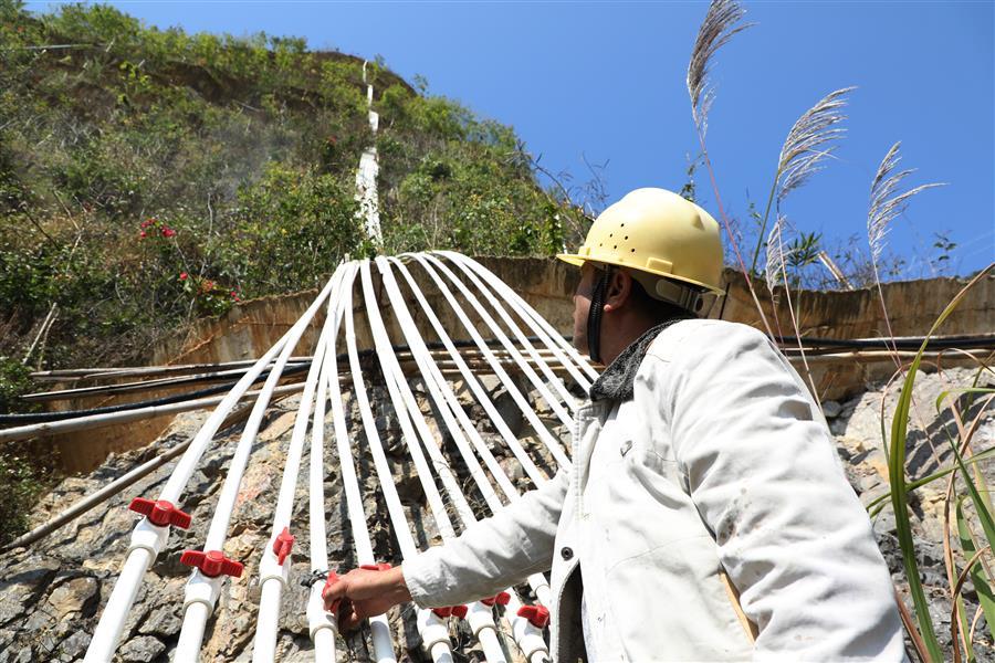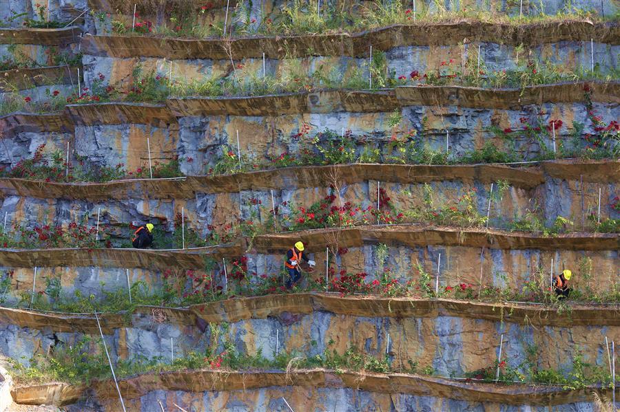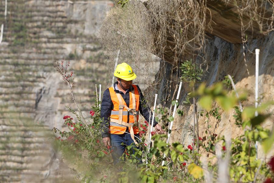 12月19日,工人在樓梯山的峭壁上養(yǎng)護(hù)綠植。