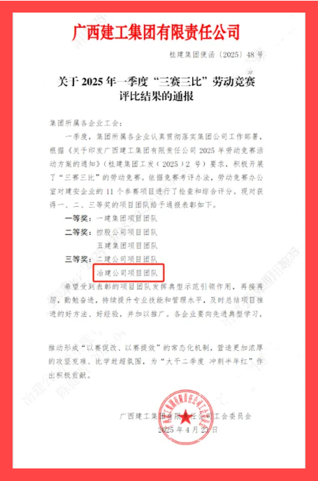 4月23日,集團(tuán)公司工會通報2025年一季度“三賽三比”勞動競賽評比結(jié)果,冶建公司項目團(tuán)隊在11個建安企業(yè)參賽項目中榮獲三等獎,彰顯了項目團(tuán)隊務(wù)實高效、團(tuán)結(jié)協(xié)作、拼搏進(jìn)取的精神風(fēng)貌。