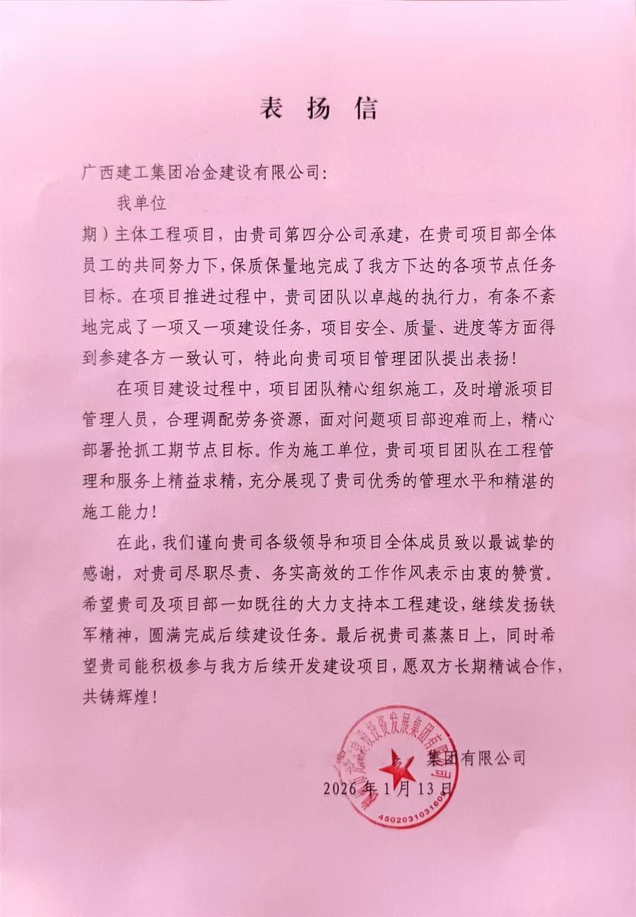 近日,冶建公司第四分公司憑借出色履約表現(xiàn),收到業(yè)主單位發(fā)來(lái)表?yè)P(yáng)信。