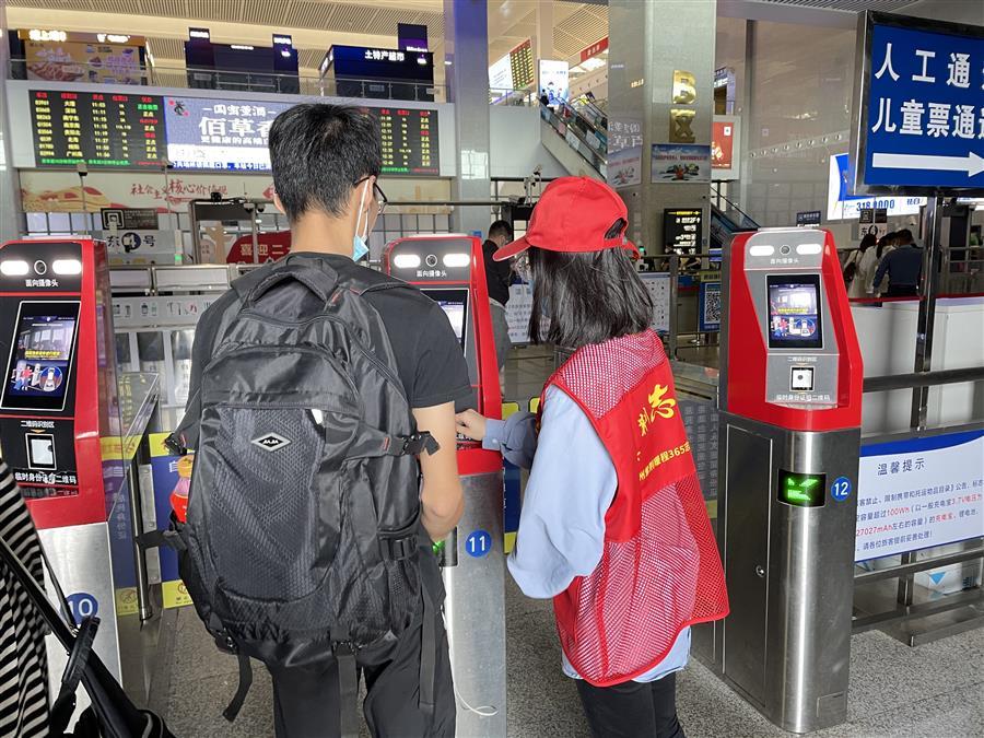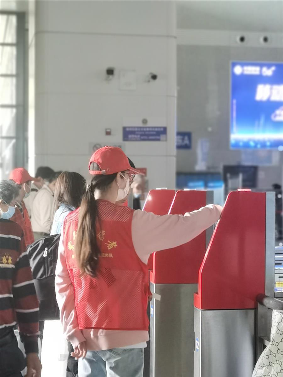 冶建志愿者們?cè)诨疖?chē)站協(xié)助車(chē)站工作人員做好疫情防控工作,在進(jìn)站口給乘客測(cè)體溫,核實(shí)健康碼、行程碼、核酸證明,引導(dǎo)乘客刷身份證進(jìn)站、為進(jìn)出站的乘客指路。