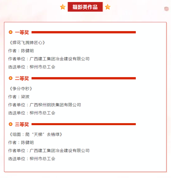 據(jù)了解,自活動(dòng)啟動(dòng)以來,全市各級工會和廣大職工朋友積極響應(yīng),共報(bào)送各類作品124件,柳州市共有14件優(yōu)秀作品獲獎(jiǎng),其中公司有2件作品獲獎(jiǎng),分別是《焊花飛濺鑄匠心》和《組圖:爬“天梯”去植綠》。